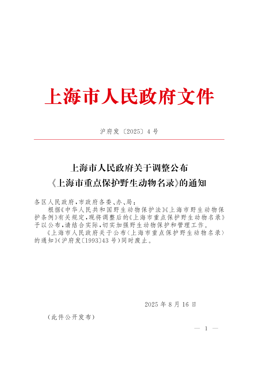 上海市人民政府關(guān)于調(diào)整公布《上海市重點(diǎn)保護(hù)野生動(dòng)物名錄》的通知