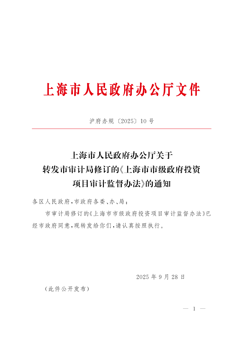 上海市人民政府辦公廳關于轉發(fā)市審計局修訂的《上海市市級政府投資項目審計監(jiān)督辦法》的通知