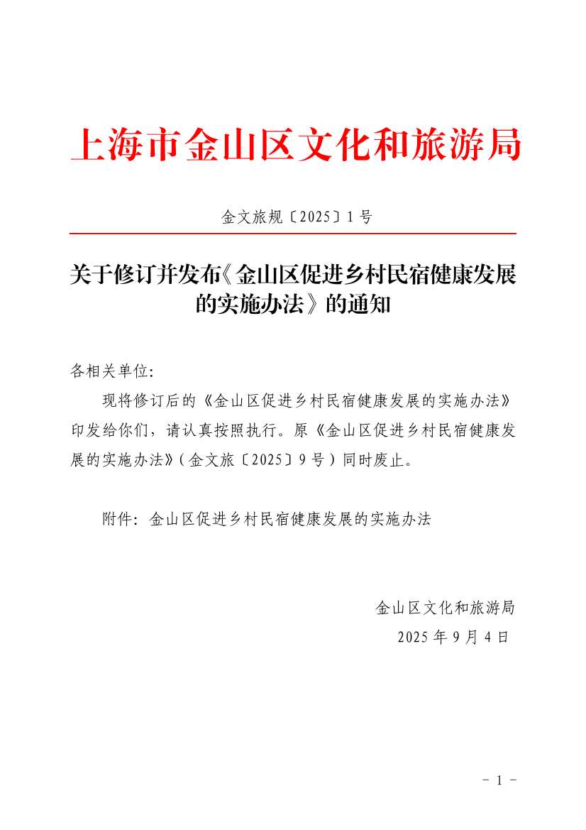 ??現(xiàn)將修訂后的《金山區(qū)促進(jìn)鄉(xiāng)村民宿健康發(fā)展的實施辦法》印發(fā)給你們,請認(rèn)真按照執(zhí)行。原《金山區(qū)促進(jìn)鄉(xiāng)村民宿健康發(fā)展的實施辦法》(金文旅〔2025〕9號)同時廢止。