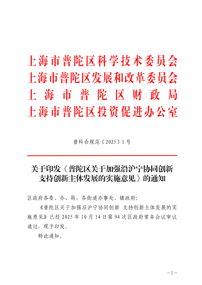 ??《普陀區(qū)關(guān)于加強(qiáng)沿滬寧協(xié)同創(chuàng)新 支持創(chuàng)新主體發(fā)展的實(shí)施意見》已經(jīng)2025年10月14日第94次區(qū)政府常務(wù)會(huì)議審議通過,現(xiàn)予印發(fā)。