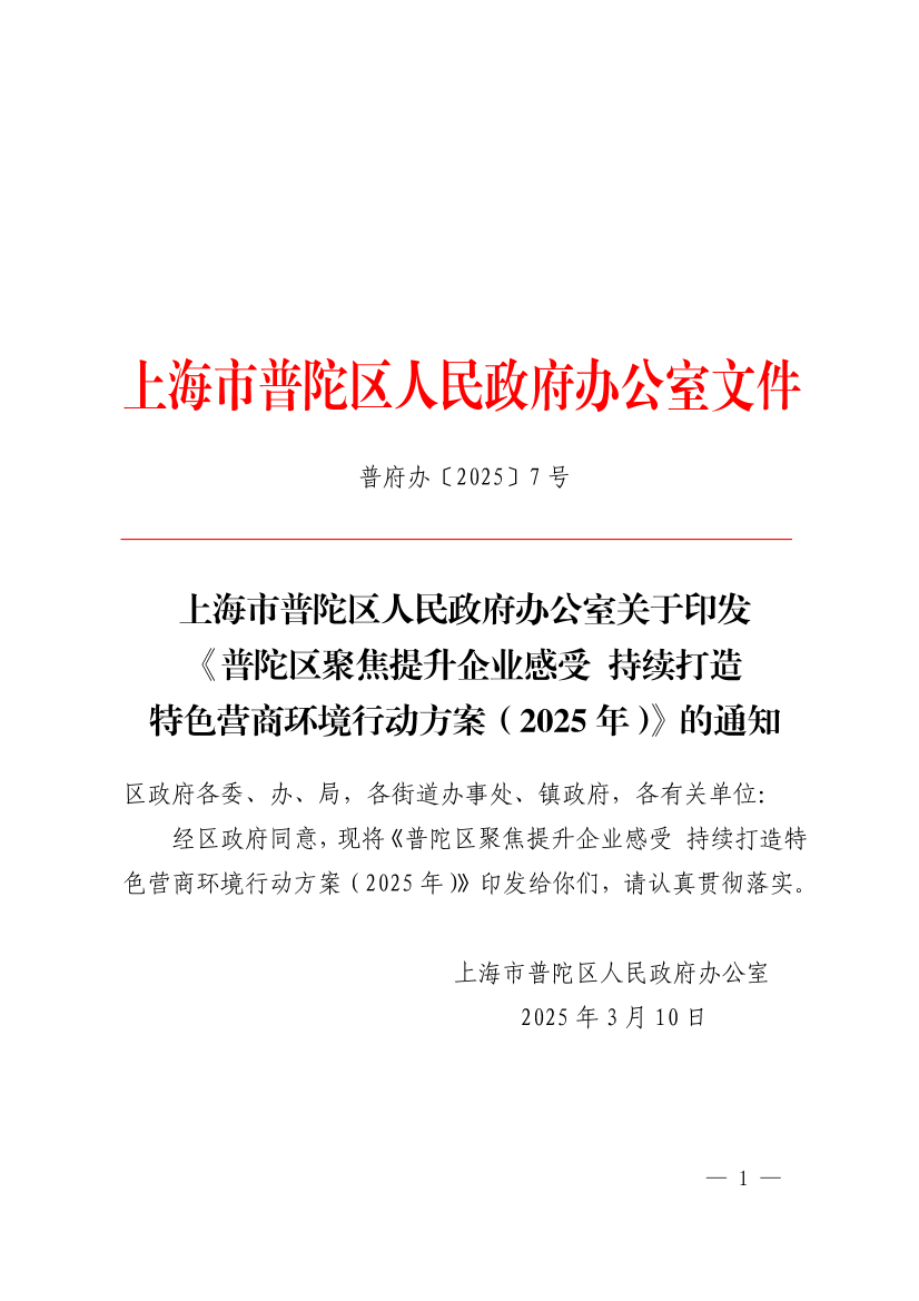 ??經(jīng)區(qū)政府同意,現(xiàn)將《普陀區(qū)聚焦提升企業(yè)感受持續(xù)打造特色營商環(huán)境行動方案(2025年)》印發(fā)給你們,請認(rèn)真貫徹落實(shí)。