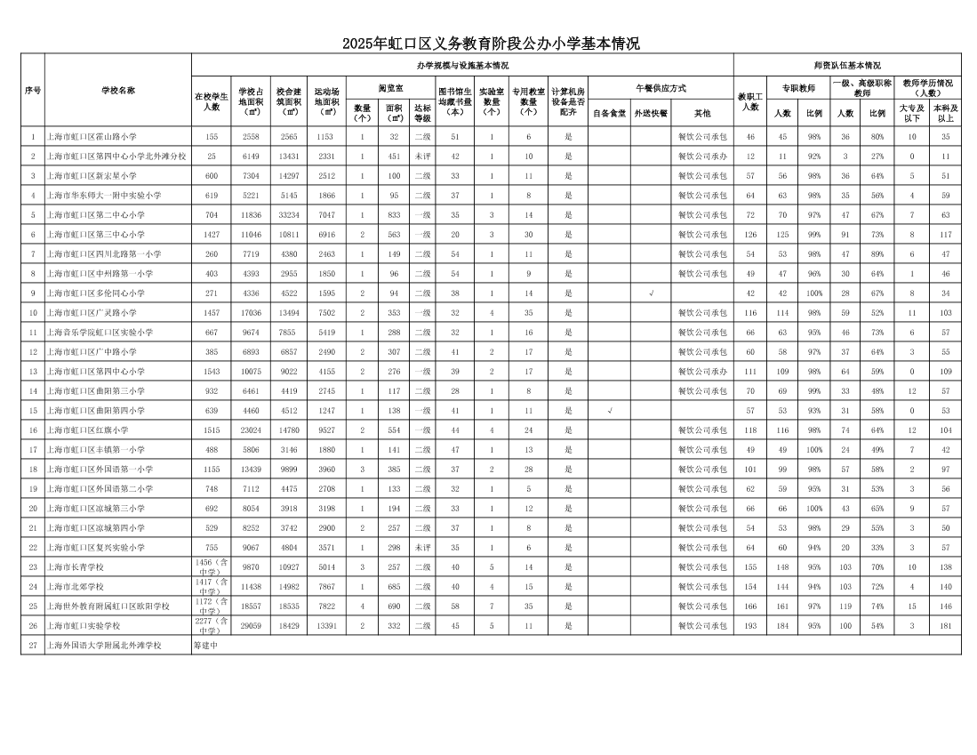 2025年虹口區(qū)義務(wù)教育階段公辦小學(xué)基本情況