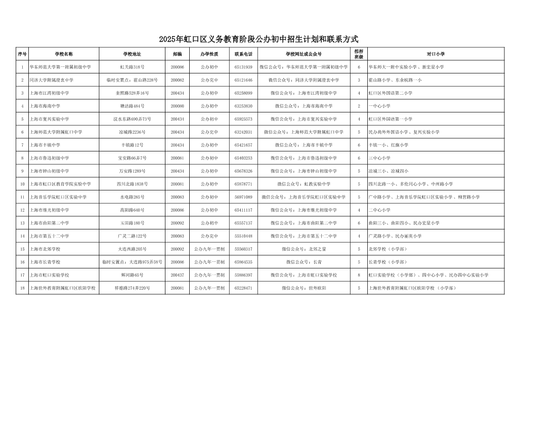 2025年虹口區(qū)義務(wù)教育階段公辦初中招生計(jì)劃和聯(lián)系方式