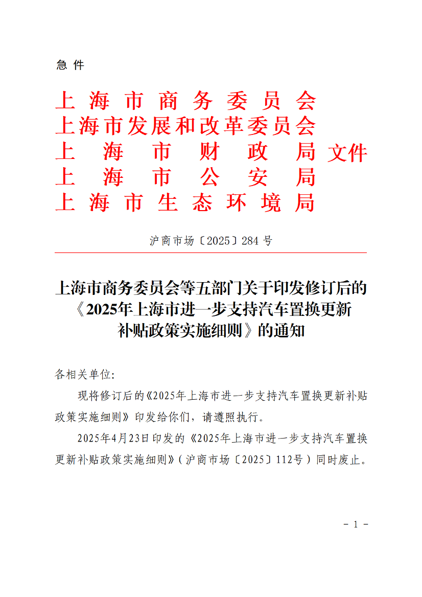 ??現(xiàn)將修訂后的《2025年上海市進(jìn)一步支持汽車置換更新補(bǔ)貼政策實(shí)施細(xì)則》印發(fā)給你們,請(qǐng)遵照?qǐng)?zhí)行。