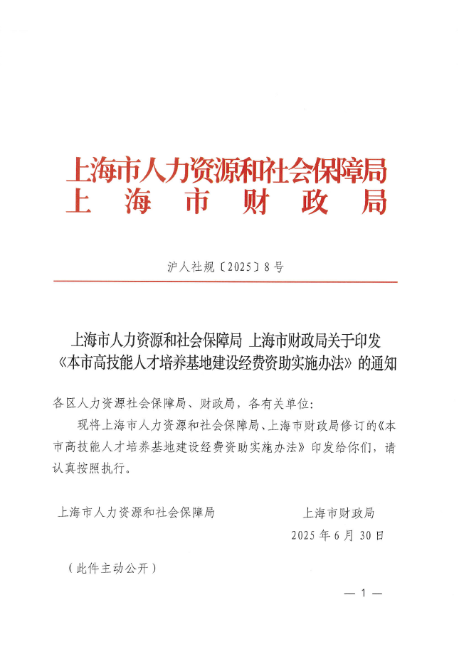 ??為進一步加強技能人才隊伍建設,為本市重點產業(yè)和新質生產力發(fā)展提供有力的技能人才支撐,根據(jù)中共中央辦公廳、國務院辦公廳《關于加強新時代高技能人才隊伍建設的意見》、市財政局等四部門《關于印發(fā)修訂后〈關于進一步完善地方教育附加資金分配使用辦法加強企業(yè)職工職業(yè)培訓的實施意見〉的通知》(滬財社〔2025〕32號),本市按照“聚焦需求、建運結合”的原則,對經認定的高技能人才培養(yǎng)基地(以下簡稱“培養(yǎng)基地”)給予建設經費資助。為規(guī)范資金使用管理,提高資金使用效益,制定本實施辦法。