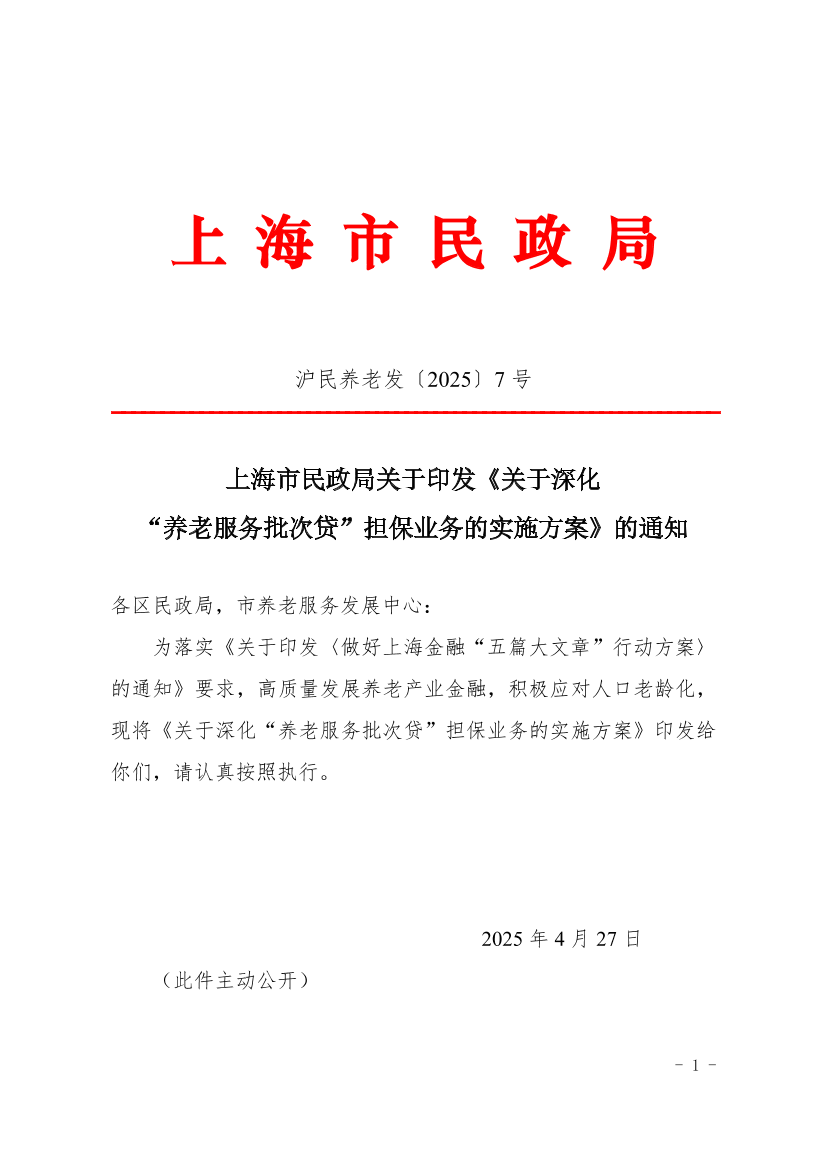??為落實(shí)《關(guān)于印發(fā)〈做好上海金融“五篇大文章”行動(dòng)方案〉的通知》要求,高質(zhì)量發(fā)展養(yǎng)老產(chǎn)業(yè)金融,積極應(yīng)對(duì)人口老齡化,現(xiàn)將《關(guān)于深化“養(yǎng)老服務(wù)批次貸”擔(dān)保業(yè)務(wù)的實(shí)施方案》印發(fā)給你們,請(qǐng)認(rèn)真按照?qǐng)?zhí)行。