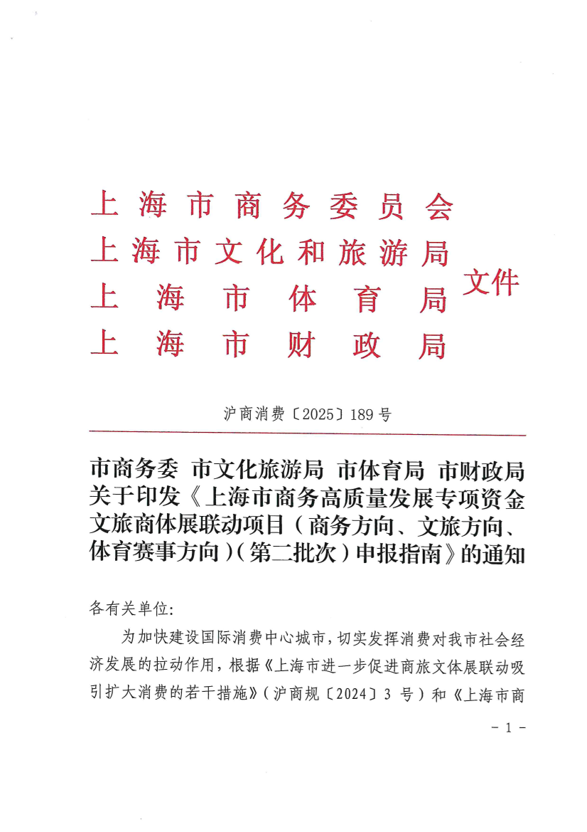 ??為加快建設(shè)國際消費(fèi)中心城市,切實(shí)發(fā)揮消費(fèi)對我市社會經(jīng)濟(jì)發(fā)展的拉動(dòng)作用,根據(jù)《上海市進(jìn)一步促進(jìn)商旅文體展聯(lián)動(dòng)吸引擴(kuò)大消費(fèi)的若干措施》(滬商規(guī)〔2024〕3號)和《上海市商務(wù)高質(zhì)量發(fā)展專項(xiàng)資金管理辦法》(滬商規(guī)〔2022〕4號)等文件精神,現(xiàn)將《上海市商務(wù)高質(zhì)量發(fā)展專項(xiàng)資金文旅商體展聯(lián)動(dòng)項(xiàng)目(商務(wù)方向、文旅方向、體育賽事方向)(第二批次)申報(bào)指南》印發(fā)給你們,請按照要求做好相關(guān)申報(bào)工作。