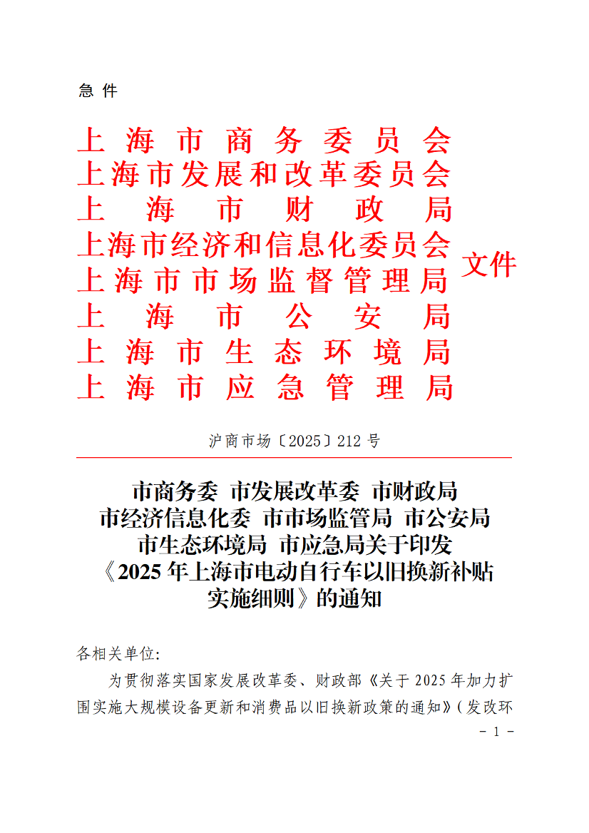 ??為貫徹落實國家發(fā)展改革委、財政部《關(guān)于2025年加力擴圍實施大規(guī)模設(shè)備更新和消費品以舊換新政策的通知》(發(fā)改環(huán)資〔2025〕13號)、《商務(wù)部等5部門辦公廳(室)關(guān)于做好2025年度電動自行車以舊換新工作的通知》(商辦流通函〔2025〕10號)、《上海市關(guān)于2025年加力擴圍推進大規(guī)模設(shè)備更新和消費品以舊換新工作的實施方案》(滬發(fā)改環(huán)資〔2025〕21號)等工作要求,現(xiàn)印發(fā)《2025年上海市電動自行車以舊換新補貼實施細則》,請認真貫徹執(zhí)行。