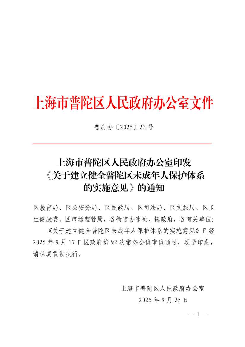 ??《關(guān)于建立健全普陀區(qū)未成年人保護(hù)體系的實(shí)施意見(jiàn)》已經(jīng)2025年9月17日區(qū)政府第92次常務(wù)會(huì)議審議通過(guò),現(xiàn)予印發(fā),請(qǐng)認(rèn)真貫徹執(zhí)行。