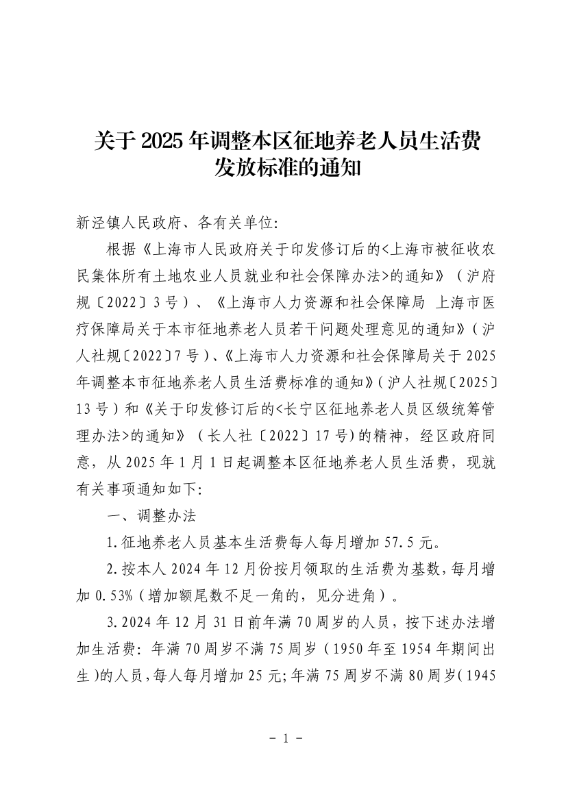 ??根據(jù)《上海市人民政府關(guān)于印發(fā)修訂后的<上海市被征收農(nóng)民集體所有土地農(nóng)業(yè)人員就業(yè)和社會(huì)保障辦法>的通知》(滬府規(guī)〔2022〕3號(hào))、《上海市人力資源和社會(huì)保障局 上海市醫(yī)療保障局關(guān)于本市征地養(yǎng)老人員若干問題處理意見的通知》(滬人社規(guī)〔2022〕7號(hào))、《上海市人力資源和社會(huì)保障局關(guān)于2025年調(diào)整本市征地養(yǎng)老人員生活費(fèi)標(biāo)準(zhǔn)的通知》(滬人社規(guī)〔2025〕13號(hào))和《關(guān)于印發(fā)修訂后的<長(zhǎng)寧區(qū)征地養(yǎng)老人員區(qū)級(jí)統(tǒng)籌管理辦法>的通知》(長(zhǎng)人社〔2022〕17號(hào))的精神,經(jīng)區(qū)政府同意,從2025年1月1日起調(diào)整本區(qū)征地養(yǎng)老人員生活費(fèi),現(xiàn)就有關(guān)事項(xiàng)通知如下: