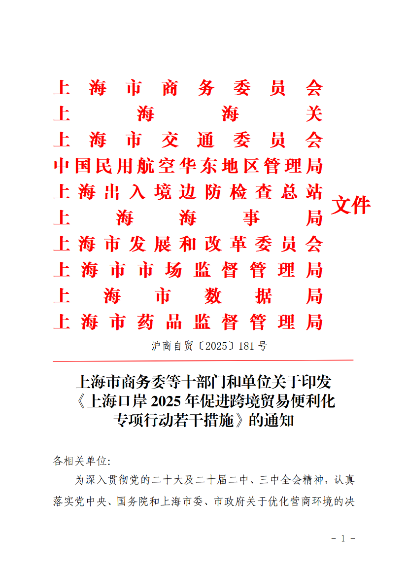 ??為深入貫徹黨的二十大及二十屆二中、三中全會(huì)精神,認(rèn)真落實(shí)黨中央、國(guó)務(wù)院和上海市委、市政府關(guān)于優(yōu)化營(yíng)商環(huán)境的決策部署,更大力度提升跨境貿(mào)易便利化水平,持續(xù)打造市場(chǎng)化、法治化、國(guó)際化一流口岸營(yíng)商環(huán)境,根據(jù)海關(guān)總署2025年跨境貿(mào)易便利化專項(xiàng)行動(dòng)部署及《上海市聚焦提升企業(yè)感受 持續(xù)打造國(guó)際一流營(yíng)商環(huán)境行動(dòng)方案》任務(wù)要求,市商務(wù)委、上海海關(guān)、市交通委、民航華東地區(qū)管理局、上海邊檢總站、上海海事局、市發(fā)展改革委、市市場(chǎng)監(jiān)管局、市數(shù)據(jù)局、市藥品監(jiān)管局等十部門和單位共同制定了《上??诎?025年促進(jìn)跨境貿(mào)易便利化專項(xiàng)行動(dòng)若干措施》,經(jīng)市政府同意,現(xiàn)印發(fā)給你們,請(qǐng)認(rèn)真做好組織實(shí)施工作。