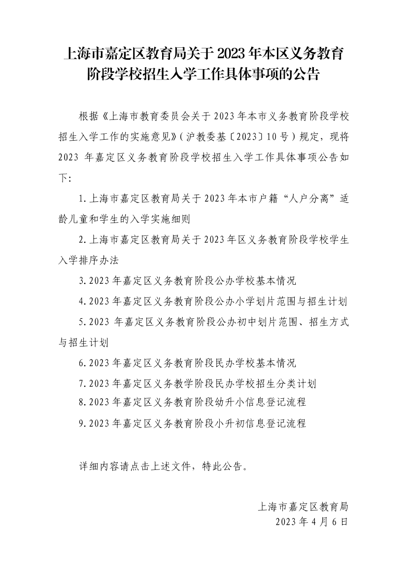 ??根據(jù)《上海市教育委員會關(guān)于2023年本市義務(wù)教育階段學校招生入學工作的實施意見》(滬教委基〔2023〕10號)規(guī)定,現(xiàn)將2023年嘉定區(qū)義務(wù)教育階段學校招生入學工作具體事項公告如下: