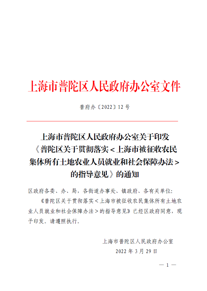 普陀區(qū)關(guān)于貫徹落實《上海市被征收農(nóng)民集體所有土地農(nóng)業(yè)人員就業(yè)和社會保障辦法》的指導(dǎo)意見