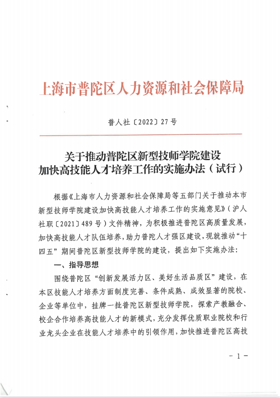 ??根據(jù)《上海市人力資源和社會(huì)保障局等五部門關(guān)于推動(dòng)本市新型技師學(xué)院建設(shè)加快高技能人才培養(yǎng)工作的實(shí)施意見(jiàn)》(滬人社職〔2021〕489號(hào))文件精神,為積極推進(jìn)普陀區(qū)高質(zhì)量發(fā)展,加快高技能人才隊(duì)伍培養(yǎng),助力普陀人才強(qiáng)區(qū)建設(shè),現(xiàn)就推動(dòng)““十四五””期間普陀區(qū)新型技師學(xué)院的建設(shè),提出如下實(shí)施辦法: