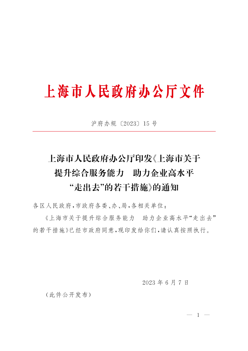 ??《上海市關(guān)于提升綜合服務(wù)能力助力企業(yè)高水平“走出去”的若干措施》已經(jīng)市政府同意,現(xiàn)印發(fā)給你們,請認(rèn)真按照執(zhí)行。