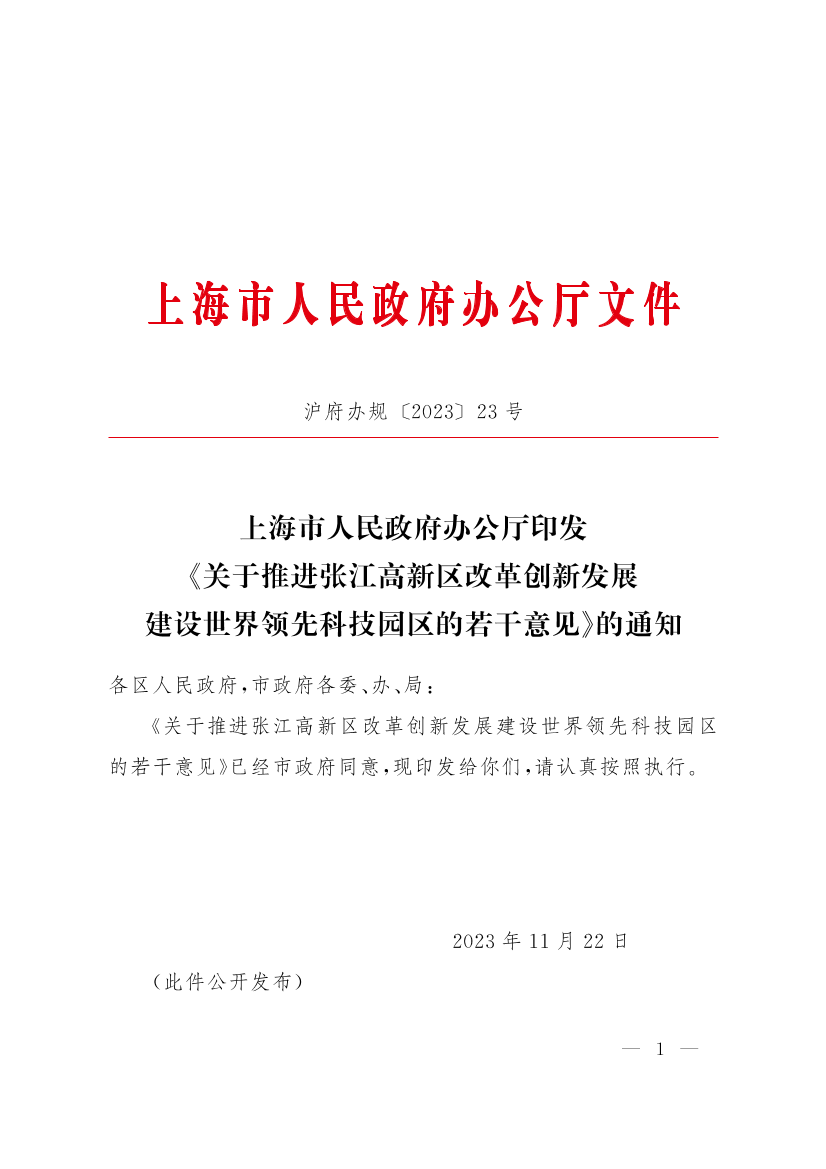 上海市人民政府辦公廳印發(fā)《關(guān)于推進(jìn)張江高新區(qū)改革創(chuàng)新發(fā)展建設(shè)世界領(lǐng)先科技園區(qū)的若干意見》的通知