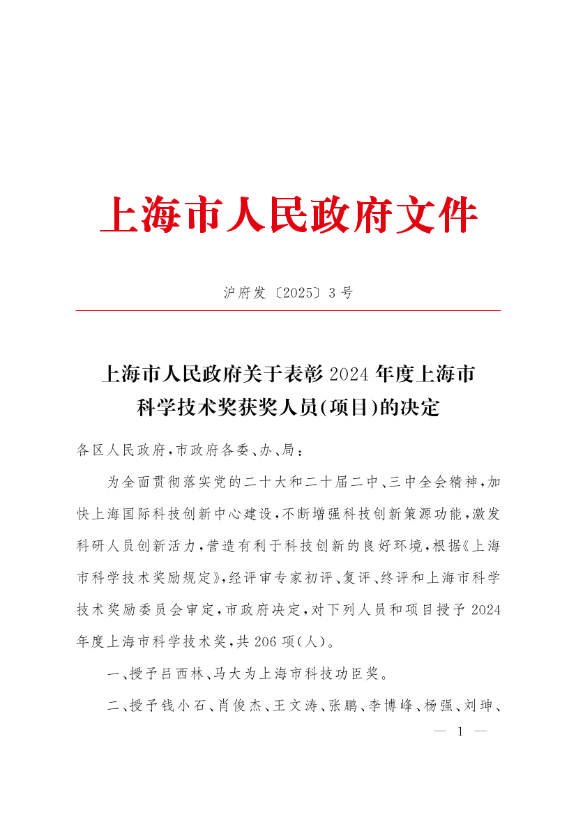 上海市人民政府關(guān)于表彰2024年度上海市科學(xué)技術(shù)獎(jiǎng)獲獎(jiǎng)人員(項(xiàng)目)的決定