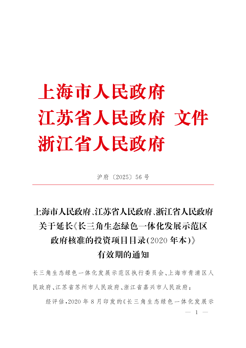 上海市人民政府、江蘇省人民政府、浙江省人民政府關(guān)于延長《長三角生態(tài)綠色一體化發(fā)展示范區(qū)政府核準(zhǔn)的投資項目目錄(2020年本)》有效期的通知