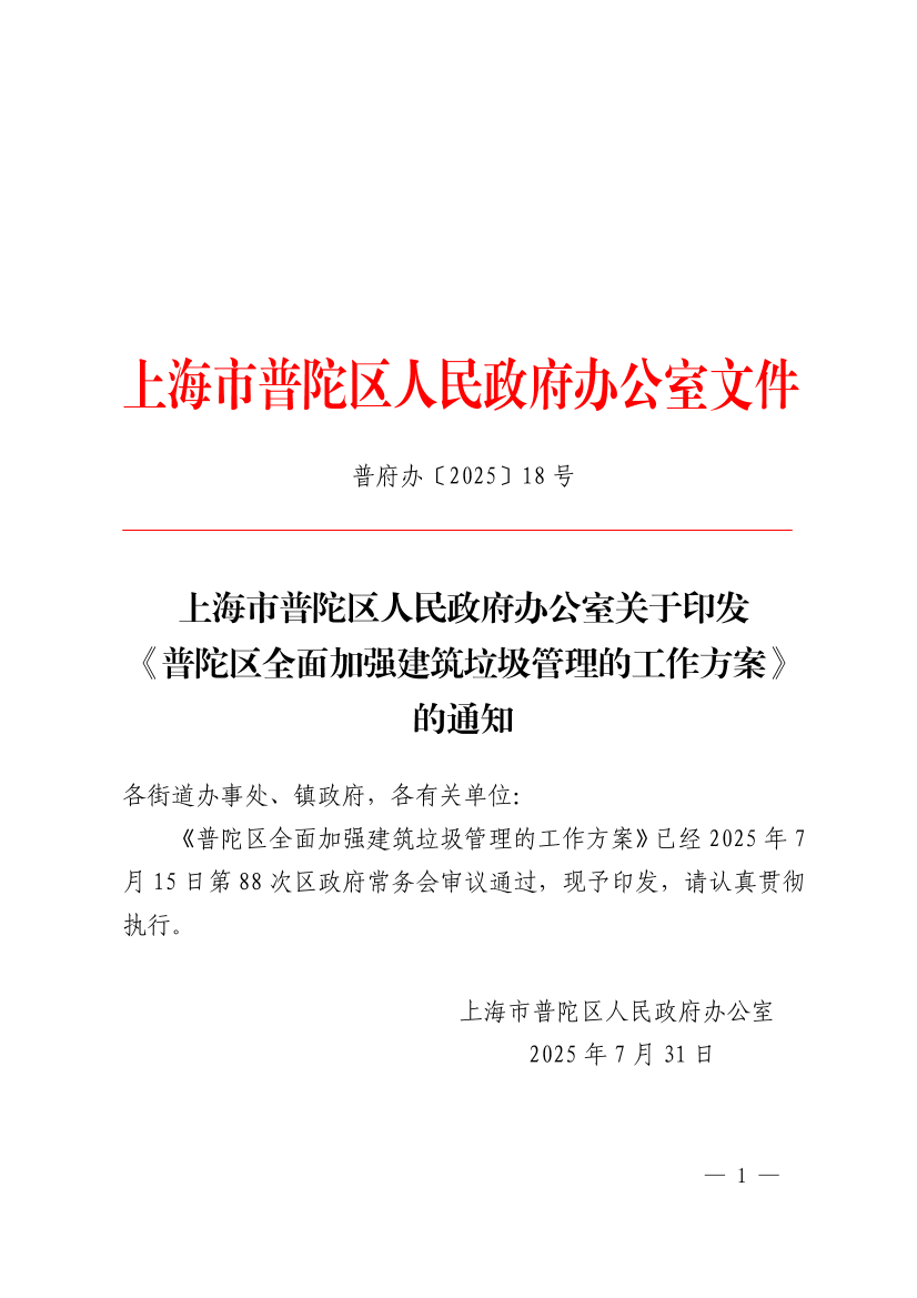 ??《普陀區(qū)全面加強(qiáng)建筑垃圾管理的工作方案》已經(jīng)2025年7月15日第88次區(qū)政府常務(wù)會(huì)審議通過,現(xiàn)予印發(fā),請認(rèn)真貫徹執(zhí)行。