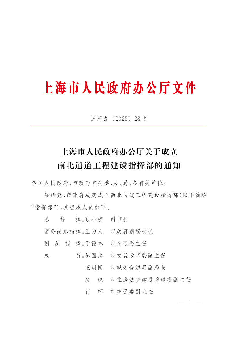 上海市人民政府辦公廳關(guān)于成立南北通道工程建設(shè)指揮部的通知