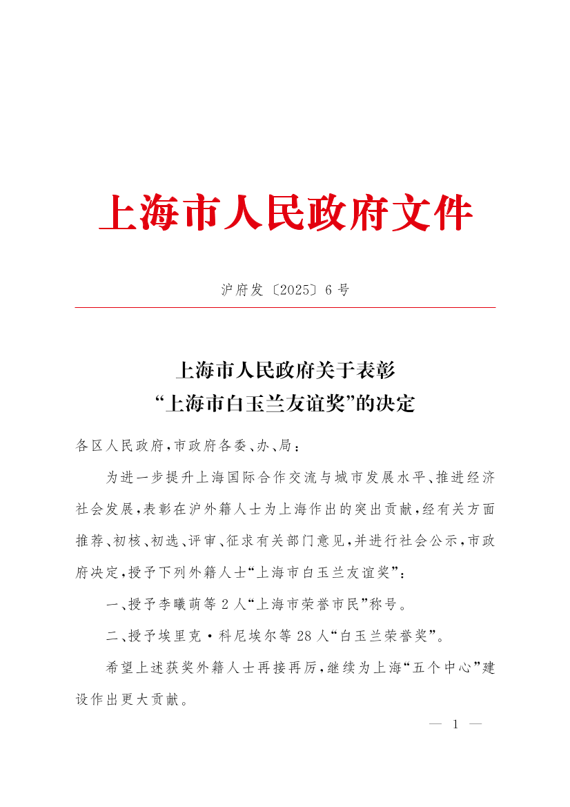 ??為進一步提升上海國際合作交流與城市發(fā)展水平、推進經濟社會發(fā)展,表彰在滬外籍人士為上海作出的突出貢獻,經有關方面推薦、初核、初選、評審、征求有關部門意見,并進行社會公示,市政府決定,授予下列外籍人士“上海市白玉蘭友誼獎”: