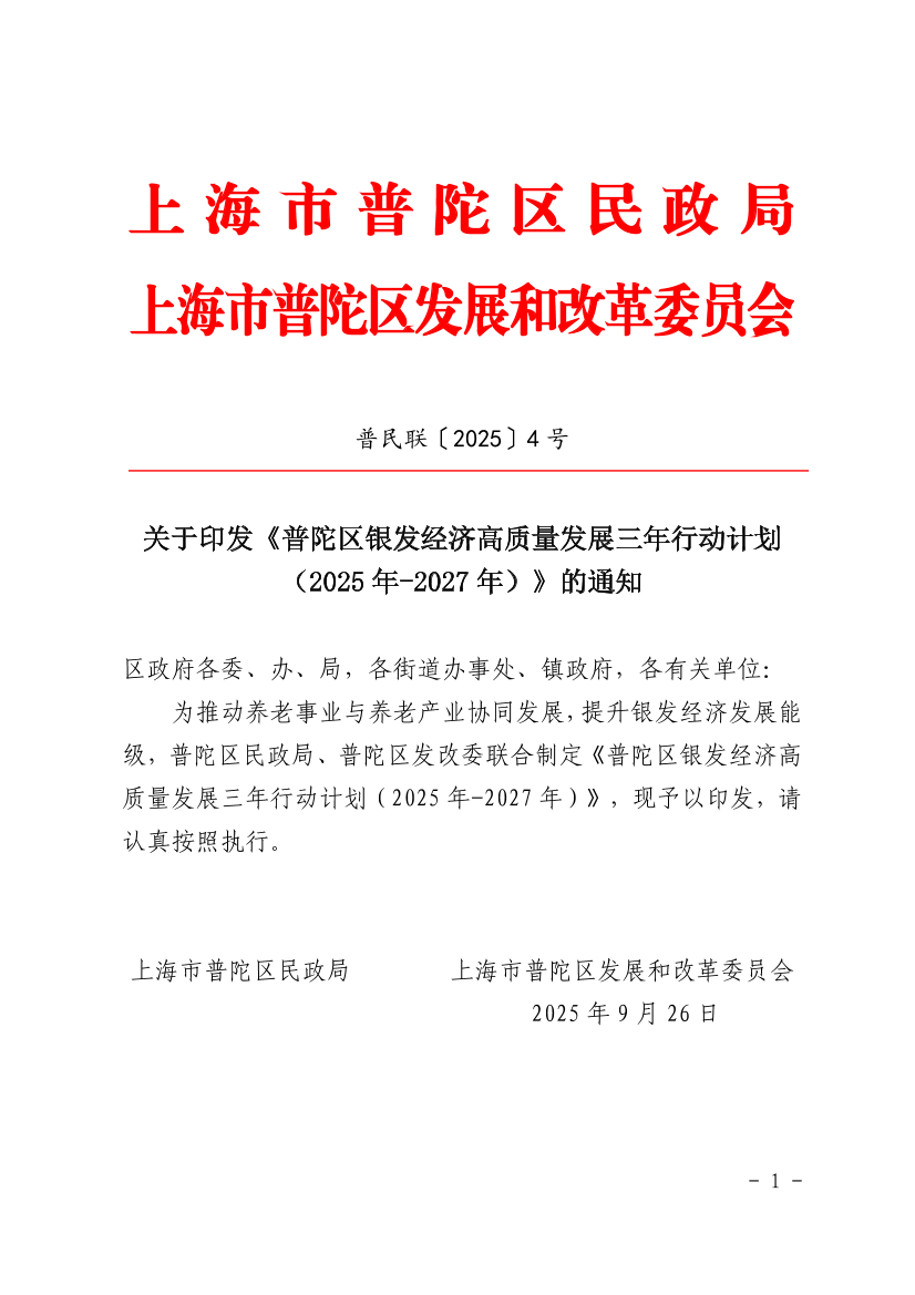 關(guān)于印發(fā)《普陀區(qū)銀發(fā)經(jīng)濟(jì)高質(zhì)量發(fā)展三年行動(dòng)計(jì)劃(2025年-2027年)》的通知