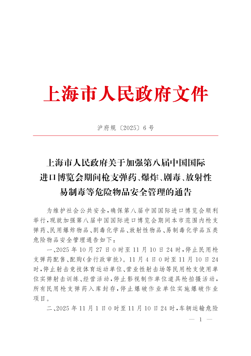 ??為維護社會公共安全,確保第八屆中國國際進口博覽會順利舉行,現(xiàn)就加強第八屆中國國際進口博覽會期間本市范圍內(nèi)槍支彈藥、民用爆炸物品、劇毒化學品、放射性物品、易制毒化學品五類危險物品安全管理通告如下:
