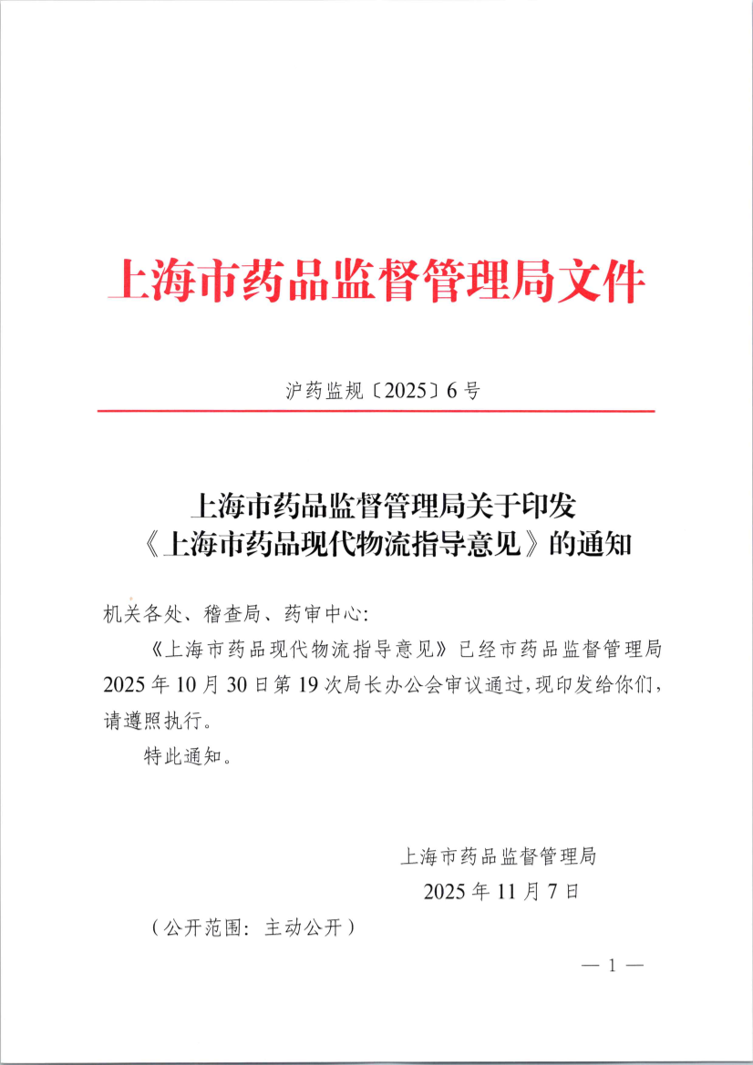 ??《上海市藥品現(xiàn)代物流指導(dǎo)意見》已經(jīng)市藥品監(jiān)督管理局2025年10月30日第19次局長辦公會(huì)審議通過,現(xiàn)印發(fā)給你們,請(qǐng)遵照?qǐng)?zhí)行。
