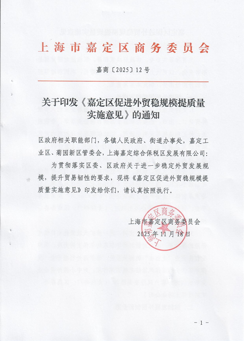 關(guān)于印發(fā)《嘉定區(qū)促進外貿(mào)穩(wěn)規(guī)模提質(zhì)量實施意見》的通知