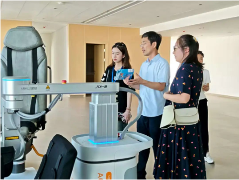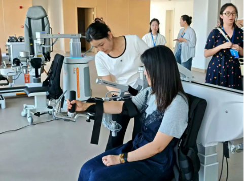 現(xiàn)場觀摩中,普陀區(qū)康復醫(yī)院工作人員帶領(lǐng)企業(yè)及群眾代表參觀新竣工驗收的康復大樓,介紹各項康復器械的用途。
