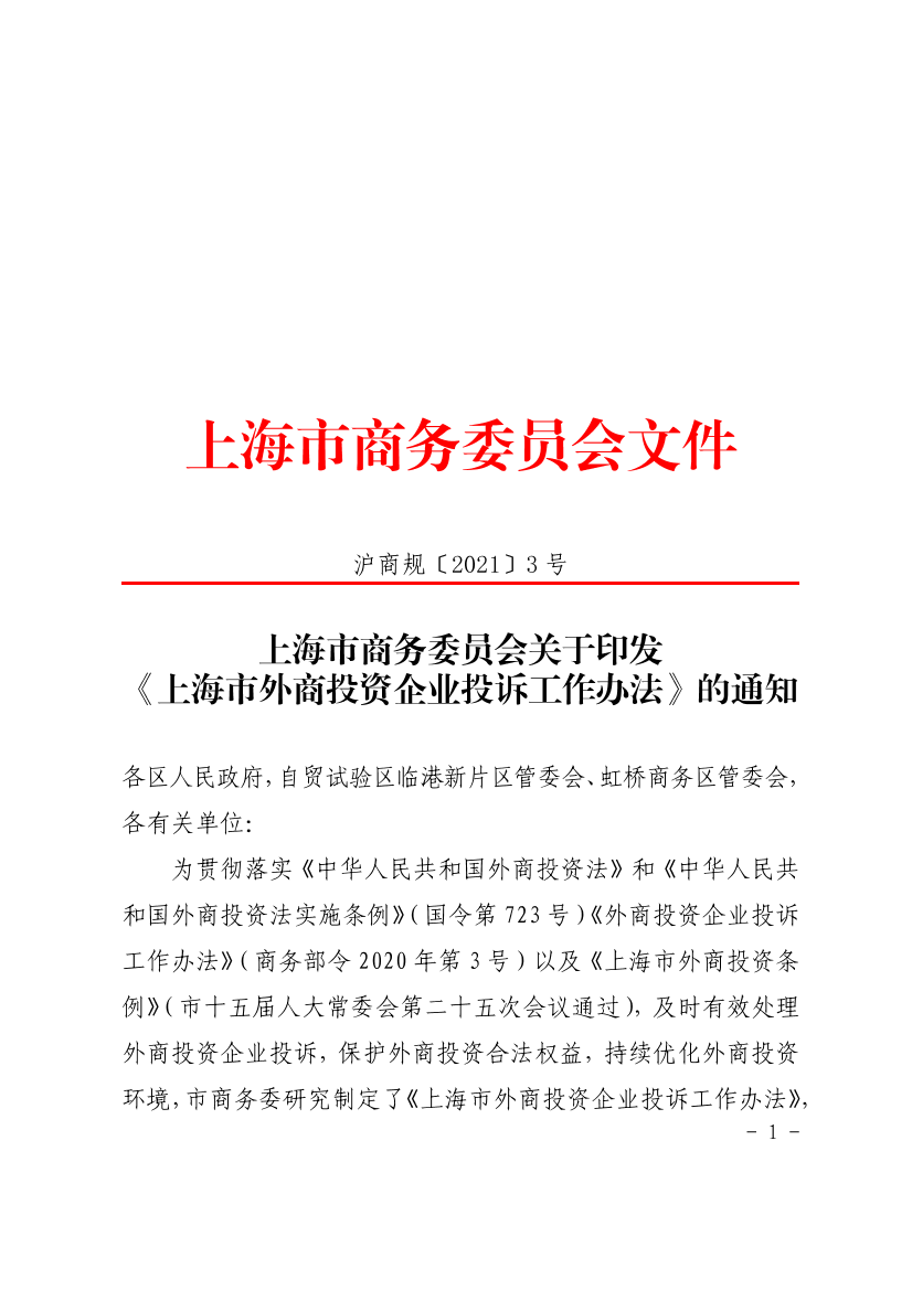 ??為貫徹落實(shí)《中華人民共和國(guó)外商投資法》和《中華人民共和國(guó)外商投資法實(shí)施條例》(國(guó)令第723號(hào))《外商投資企業(yè)投訴工作辦法》(商務(wù)部令2020年第3號(hào))以及《上海市外商投資條例》(市十五屆人大常委會(huì)第二十五次會(huì)議通過(guò)),及時(shí)有效處理外商投資企業(yè)投訴,保護(hù)外商投資合法權(quán)益,持續(xù)優(yōu)化外商投資環(huán)境,市商務(wù)委研究制定了《上海市外商投資企業(yè)投訴工作辦法》,現(xiàn)印發(fā)給你們,請(qǐng)結(jié)合實(shí)際認(rèn)真貫徹執(zhí)行。