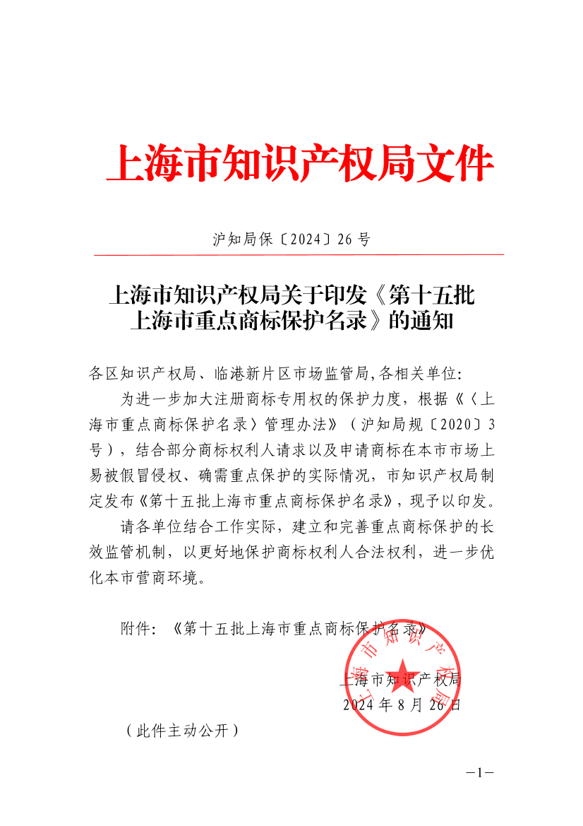 ??為進(jìn)一步加大注冊(cè)商標(biāo)專用權(quán)的保護(hù)力度,根據(jù)《〈上海市重點(diǎn)商標(biāo)保護(hù)名錄〉管理辦法》(滬知局規(guī)〔2020〕3號(hào)),結(jié)合部分商標(biāo)權(quán)利人請(qǐng)求以及申請(qǐng)商標(biāo)在本市市場(chǎng)上易被假冒侵權(quán)、確需重點(diǎn)保護(hù)的實(shí)際情況,市知識(shí)產(chǎn)權(quán)局制定發(fā)布《第十五批上海市重點(diǎn)商標(biāo)保護(hù)名錄》,現(xiàn)予以印發(fā)。