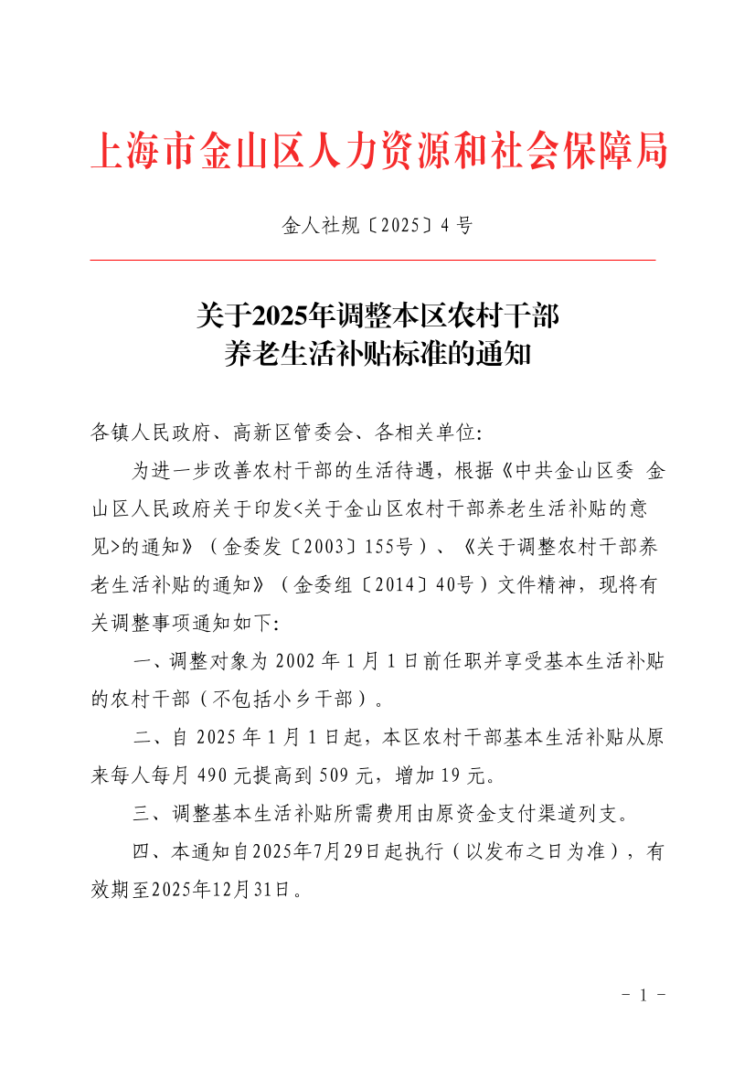 ??二、自2025年1月1日起,本區(qū)農村干部基本生活補貼從原來每人每月490元提高到509元,增加19元。