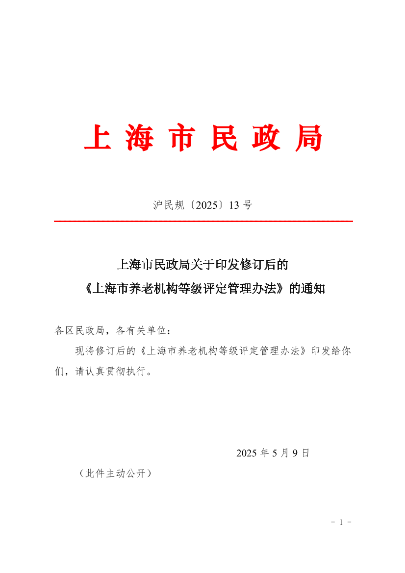 ??現(xiàn)將修訂后的《上海市養(yǎng)老機(jī)構(gòu)等級評定管理辦法》印發(fā)給你們,請認(rèn)真貫徹執(zhí)行。