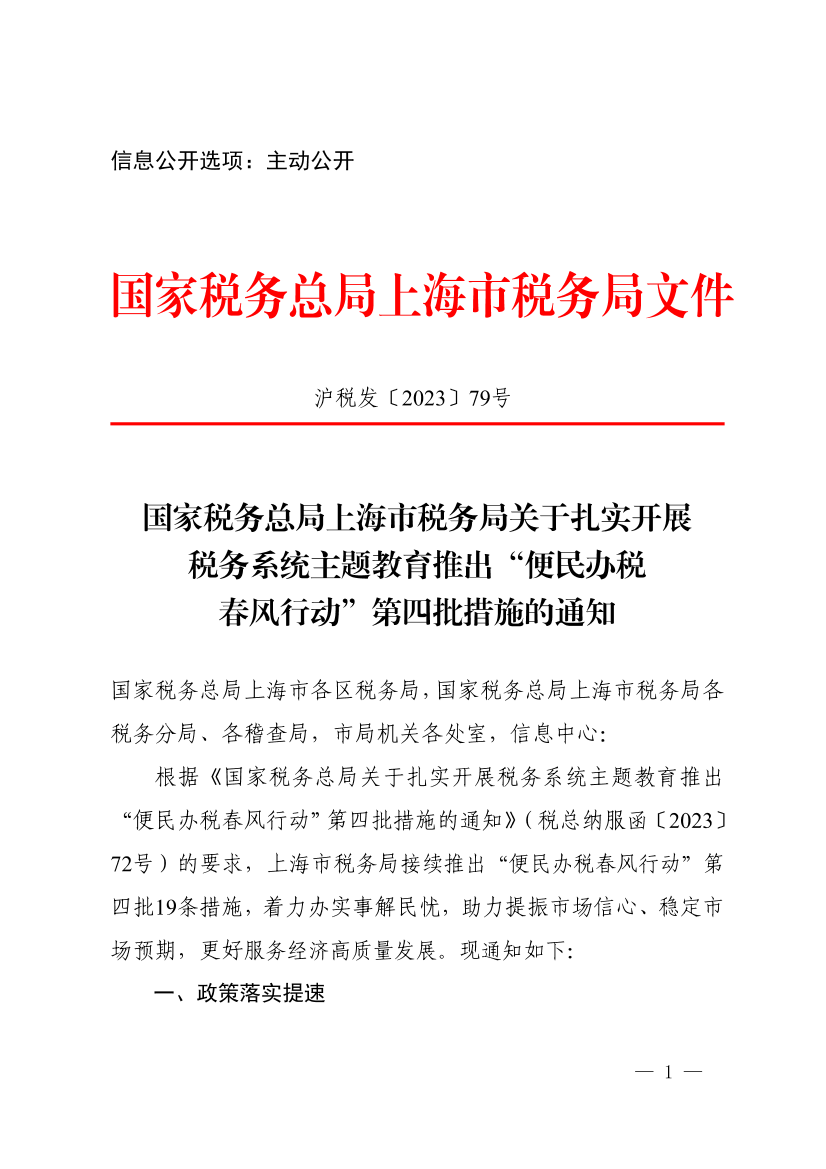 ??根據(jù)《國家稅務(wù)總局關(guān)于扎實(shí)開展稅務(wù)系統(tǒng)主題教育推出“便民辦稅春風(fēng)行動”第四批措施的通知》(稅總納服函〔2023〕72號)的要求,上海市稅務(wù)局接續(xù)推出“便民辦稅春風(fēng)行動”第四批19條措施,著力辦實(shí)事解民憂,助力提振市場信心、穩(wěn)定市場預(yù)期,更好服務(wù)經(jīng)濟(jì)高質(zhì)量發(fā)展?,F(xiàn)通知如下: