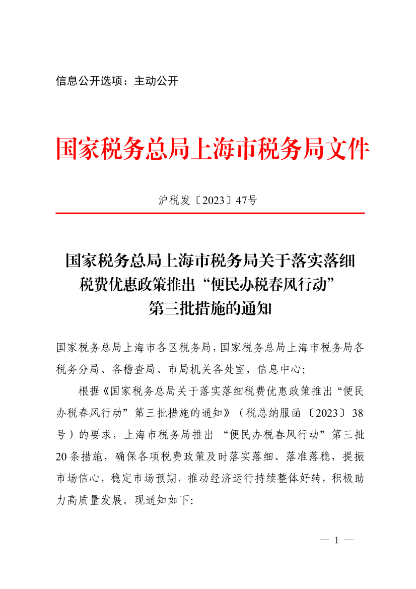 ??根據(jù)《國家稅務(wù)總局關(guān)于落實落細稅費優(yōu)惠政策推出“便民辦稅春風行動”第三批措施的通知》(稅總納服函〔2023〕38號)的要求,上海市稅務(wù)局推出 “便民辦稅春風行動”第三批20條措施,確保各項稅費政策及時落實落細、落準落穩(wěn),提振市場信心,穩(wěn)定市場預期,推動經(jīng)濟運行持續(xù)整體好轉(zhuǎn),積極助力高質(zhì)量發(fā)展?,F(xiàn)通知如下: