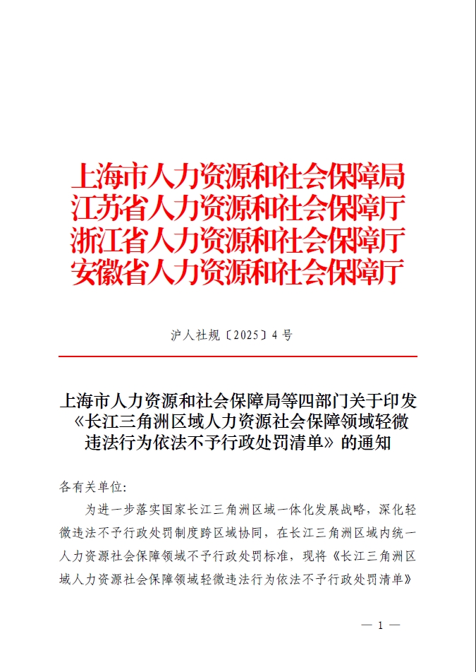 ??為進(jìn)一步落實(shí)國(guó)家長(zhǎng)江三角洲區(qū)域一體化發(fā)展戰(zhàn)略,深化輕微違法不予行政處罰制度跨區(qū)域協(xié)同,在長(zhǎng)江三角洲區(qū)域內(nèi)統(tǒng)一人力資源社會(huì)保障領(lǐng)域不予行政處罰標(biāo)準(zhǔn),現(xiàn)將《長(zhǎng)江三角洲區(qū)域人力資源社會(huì)保障領(lǐng)域輕微違法行為依法不予行政處罰清單》印發(fā)給你們,請(qǐng)認(rèn)真組織實(shí)施。