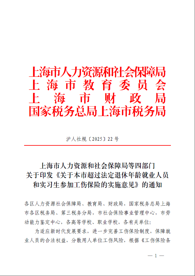 ??為適應(yīng)新時(shí)代發(fā)展要求,進(jìn)一步完善工傷保險(xiǎn)制度,保障就業(yè)人員的合法權(quán)益,分散用人單位工傷風(fēng)險(xiǎn),根據(jù)《工傷保險(xiǎn)條例》《上海市工傷保險(xiǎn)實(shí)施辦法》,結(jié)合本市實(shí)際,現(xiàn)就本市超過(guò)法定退休年齡就業(yè)人員(以下簡(jiǎn)稱(chēng)“超齡就業(yè)人員”)和實(shí)習(xí)生參加工傷保險(xiǎn)提出實(shí)施意見(jiàn),現(xiàn)印發(fā)給你們,請(qǐng)遵照?qǐng)?zhí)行。