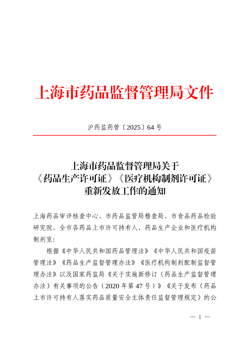滬藥監(jiān)藥管〔2025〕64號(hào)