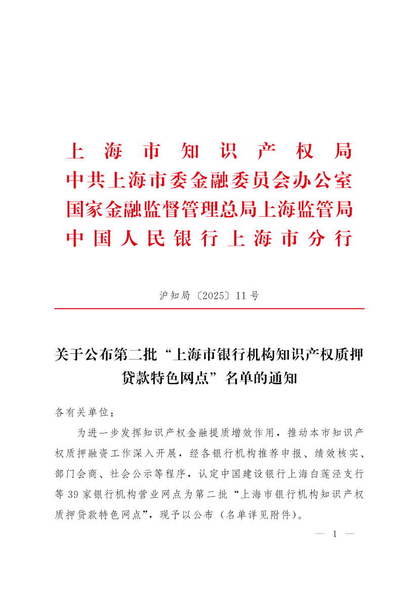 ??為進(jìn)一步發(fā)揮知識(shí)產(chǎn)權(quán)金融提質(zhì)增效作用,推動(dòng)本市知識(shí)產(chǎn)權(quán)質(zhì)押融資工作深入開展,經(jīng)各銀行機(jī)構(gòu)推薦申報(bào)、績(jī)效核實(shí)、部門會(huì)商、社會(huì)公示等程序,認(rèn)定中國(guó)建設(shè)銀行上海白蓮涇支行等39家銀行機(jī)構(gòu)營(yíng)業(yè)網(wǎng)點(diǎn)為第二批“上海市銀行機(jī)構(gòu)知識(shí)產(chǎn)權(quán)質(zhì)押貸款特色網(wǎng)點(diǎn)”,現(xiàn)予以公布(名單詳見附件)。