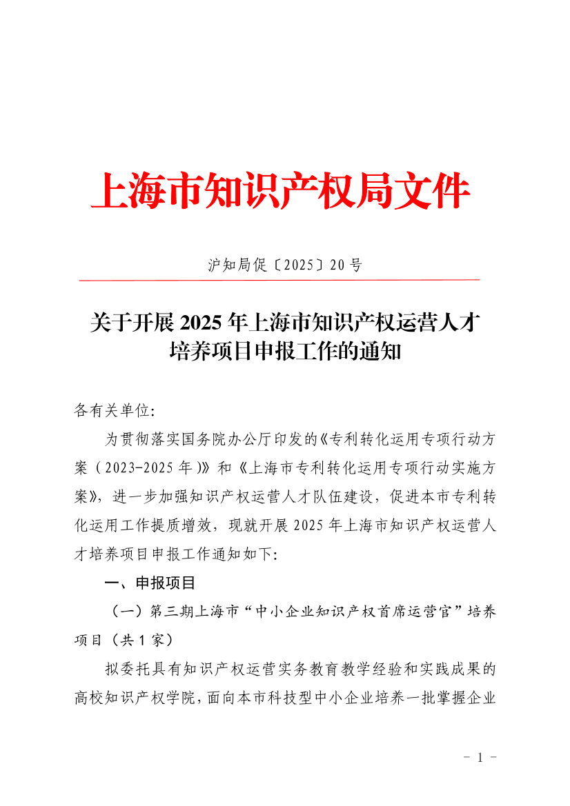 ??為貫徹落實國務(wù)院辦公廳印發(fā)的《專利轉(zhuǎn)化運用專項行動方案(2023-2025年)》和《上海市專利轉(zhuǎn)化運用專項行動實施方案》,進(jìn)一步加強知識產(chǎn)權(quán)運營人才隊伍建設(shè),促進(jìn)本市專利轉(zhuǎn)化運用工作提質(zhì)增效,現(xiàn)就開展2025年上海市知識產(chǎn)權(quán)運營人才培養(yǎng)項目申報工作通知如下: