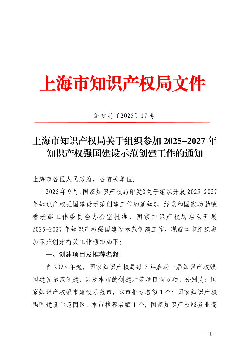 ??2025年9月,國(guó)家知識(shí)產(chǎn)權(quán)局印發(fā)《關(guān)于組織開(kāi)展2025-2027年知識(shí)產(chǎn)權(quán)強(qiáng)國(guó)建設(shè)示范創(chuàng)建工作的通知》,經(jīng)黨和國(guó)家功勛榮譽(yù)表彰工作委員會(huì)辦公室批準(zhǔn),國(guó)家知識(shí)產(chǎn)權(quán)局啟動(dòng)開(kāi)展2025-2027年知識(shí)產(chǎn)權(quán)強(qiáng)國(guó)建設(shè)示范創(chuàng)建工作,現(xiàn)就本市組織參加示范創(chuàng)建有關(guān)工作通知如下: