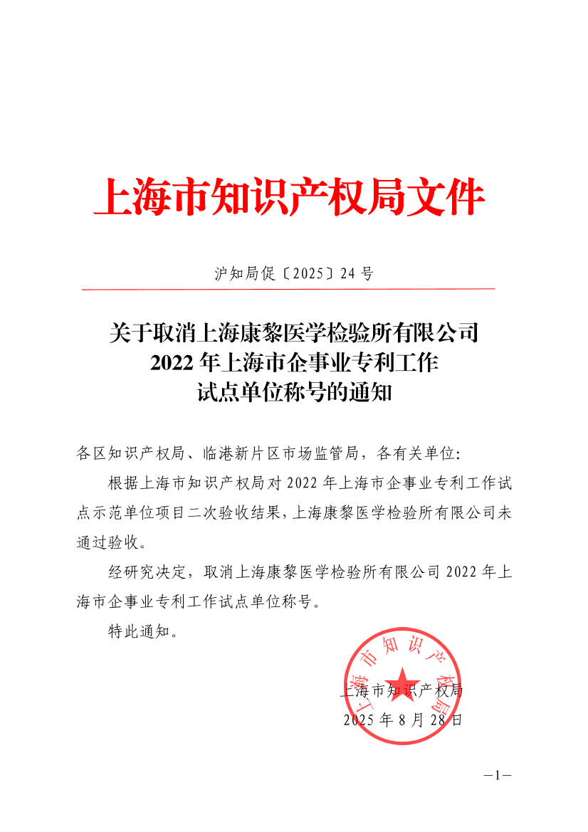 ??經(jīng)研究決定,取消上海康黎醫(yī)學(xué)檢驗(yàn)所有限公司2022年上海市企事業(yè)專利工作試點(diǎn)單位稱號。