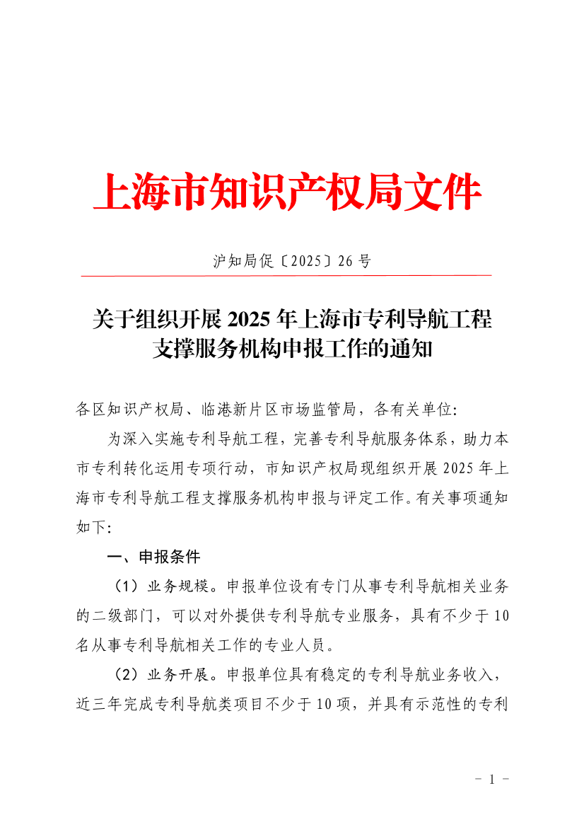 ??為深入實(shí)施專利導(dǎo)航工程,完善專利導(dǎo)航服務(wù)體系,助力本市專利轉(zhuǎn)化運(yùn)用專項(xiàng)行動(dòng),市知識(shí)產(chǎn)權(quán)局現(xiàn)組織開展2025年上海市專利導(dǎo)航工程支撐服務(wù)機(jī)構(gòu)申報(bào)與評(píng)定工作。有關(guān)事項(xiàng)通知如下: