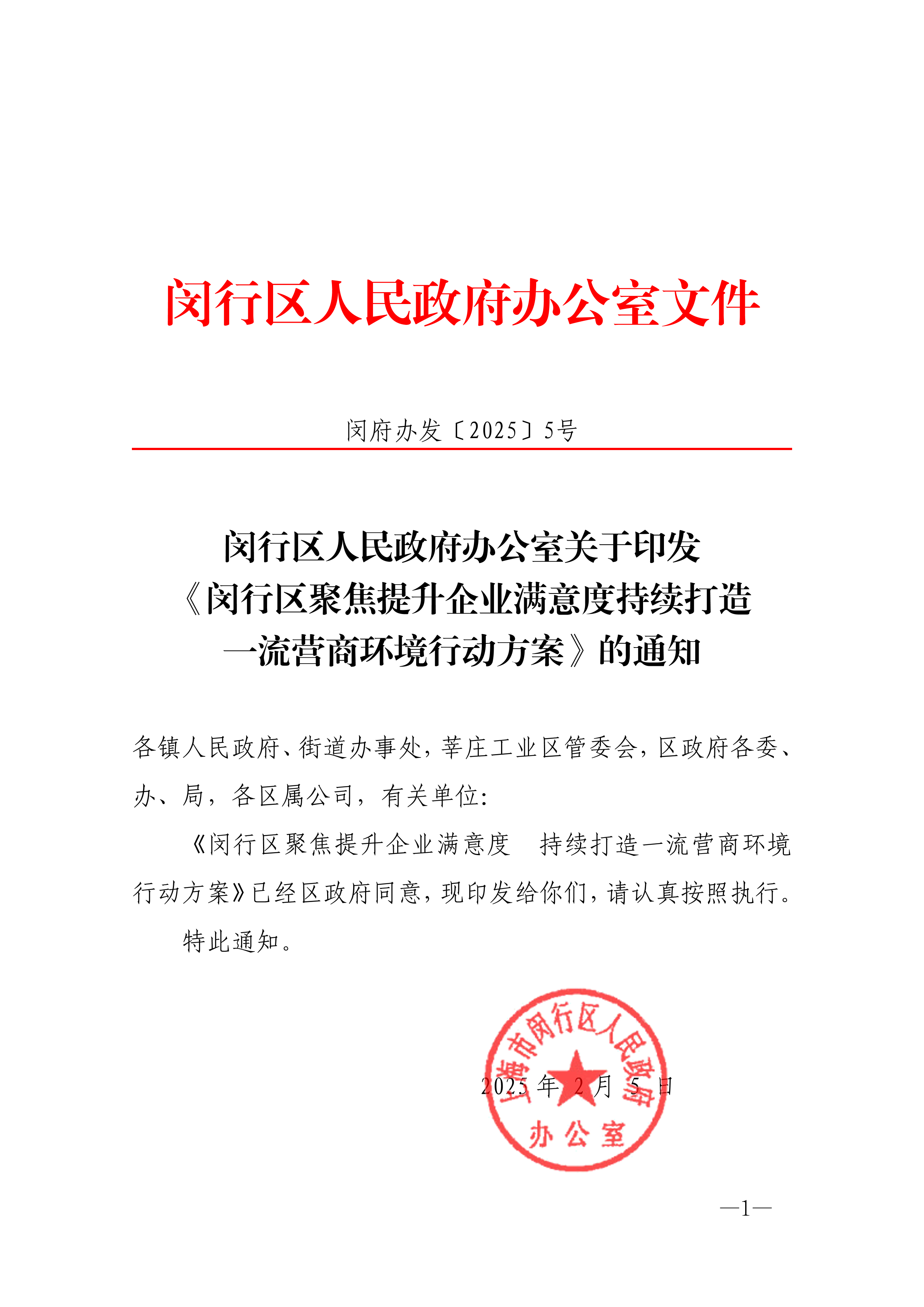 閔行區(qū)人民政府辦公室關(guān)于印發(fā)《閔行區(qū)聚焦提升企業(yè)滿意度持續(xù)打造一流營商環(huán)境行動(dòng)方案》的通知