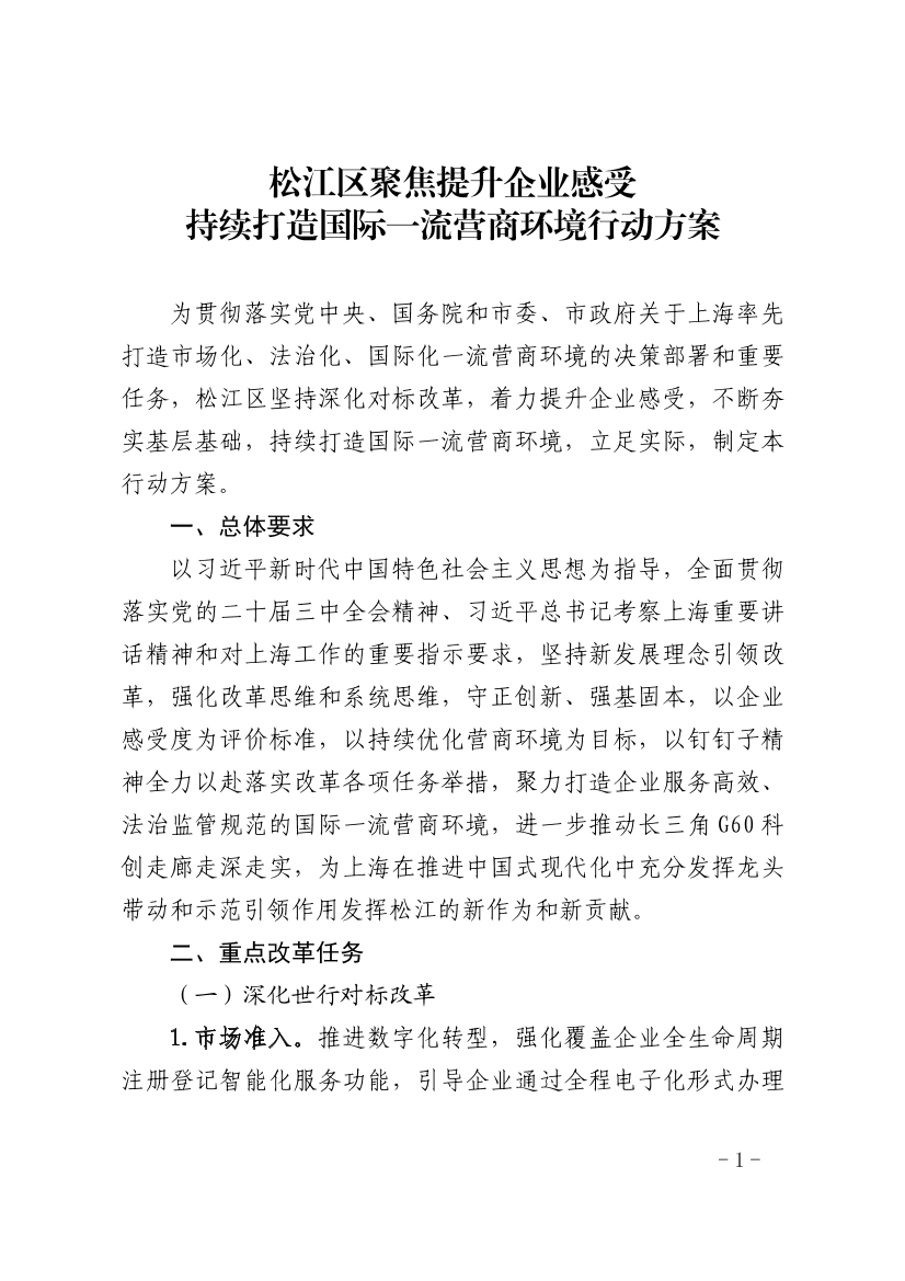 ??為貫徹落實(shí)黨中央、國務(wù)院和市委、市政府關(guān)于上海率先打造市場化、法治化、國際化一流營商環(huán)境的決策部署和重要任務(wù),松江區(qū)堅(jiān)持深化對標(biāo)改革,著力提升企業(yè)感受,不斷夯實(shí)基層基礎(chǔ),持續(xù)打造國際一流營商環(huán)境,立足實(shí)際,制定本行動(dòng)方案。