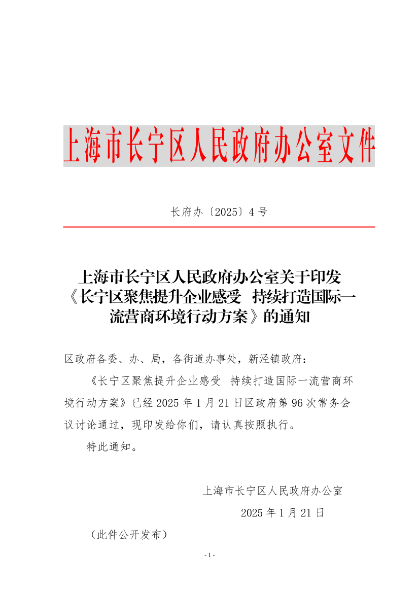 上海市長寧區(qū)人民政府辦公室關(guān)于印發(fā)《長寧區(qū)聚焦提升企業(yè)感受 持續(xù)打造國際一流營商環(huán)境行動方案》的通知
