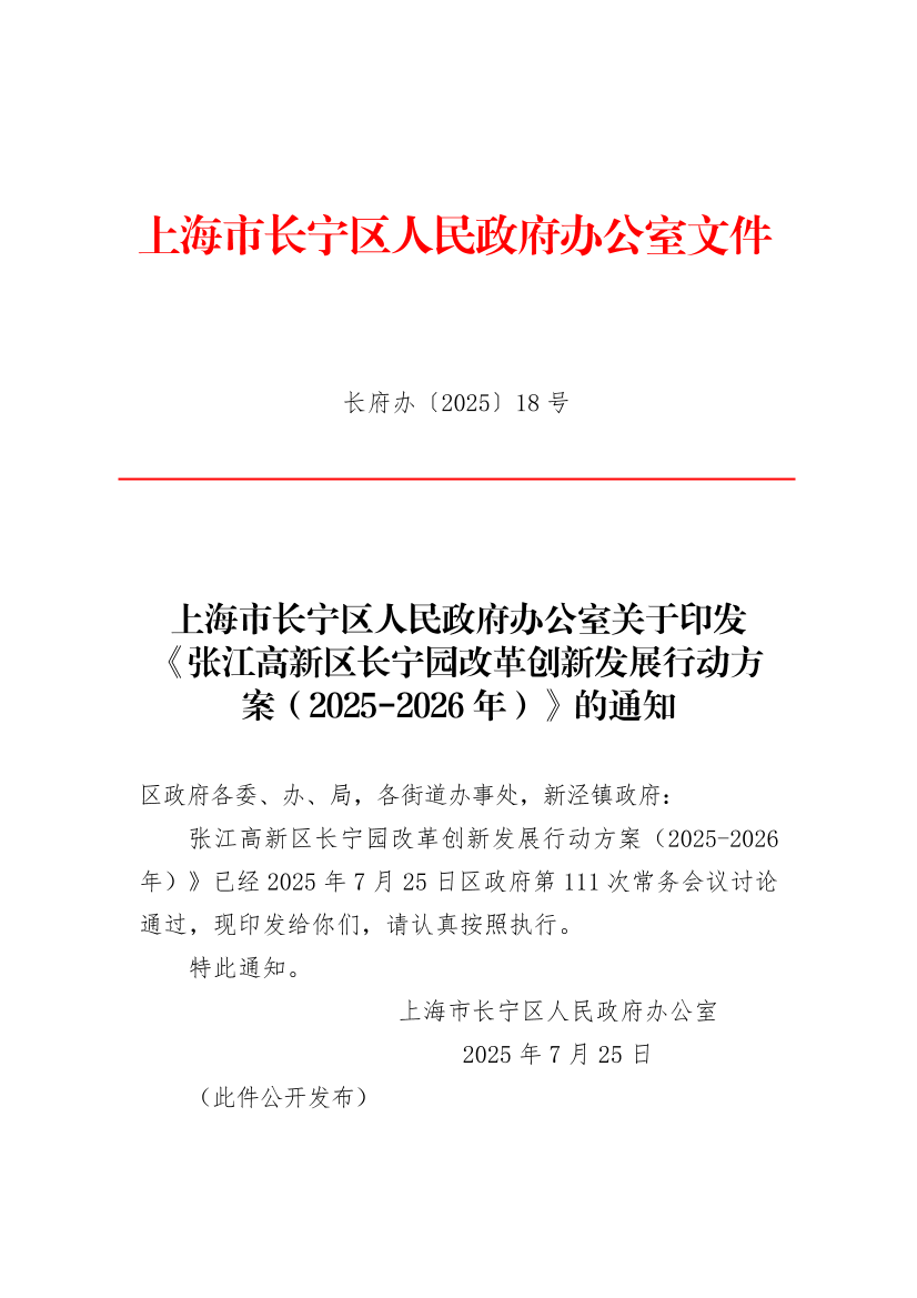 ??張江高新區(qū)長寧園改革創(chuàng)新發(fā)展行動方案(2025-2026年)》已經(jīng)2025年7月25日區(qū)政府第111次常務會議討論通過,現(xiàn)印發(fā)給你們,請認真按照執(zhí)行。