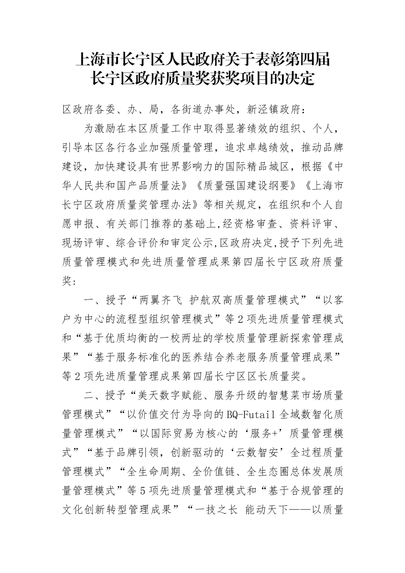 上海市長(zhǎng)寧區(qū)人民政府關(guān)于表彰第四屆長(zhǎng)寧區(qū)政府質(zhì)量獎(jiǎng)獲獎(jiǎng)項(xiàng)目的決定