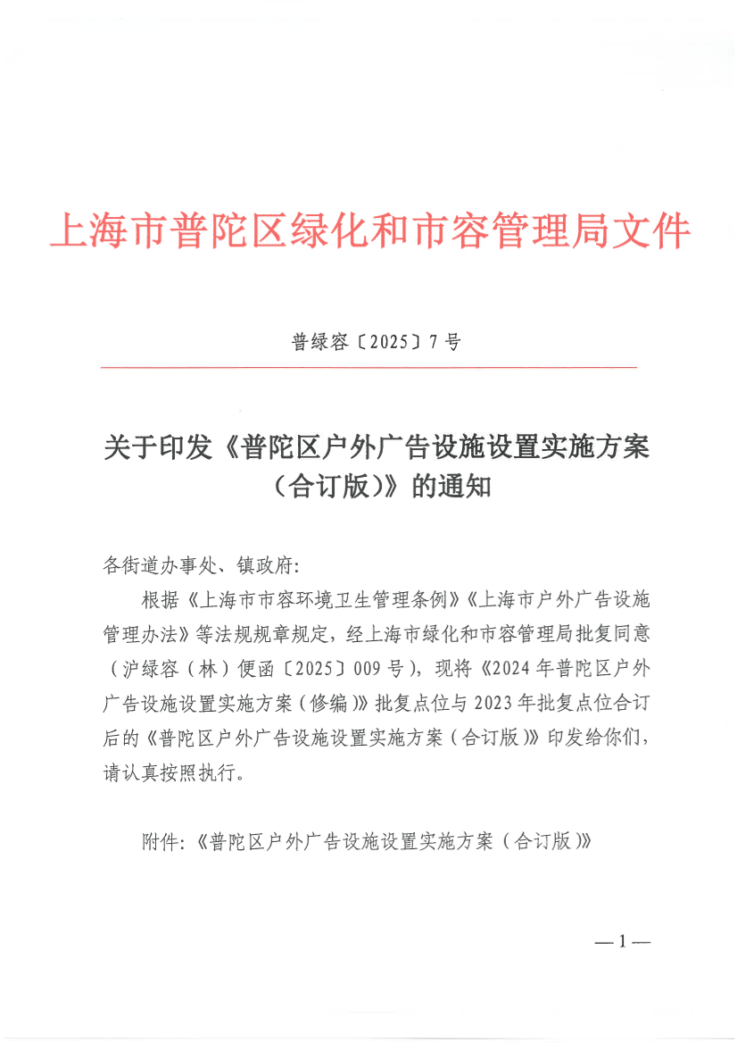 ??根據(jù)《上海市市容環(huán)境衛(wèi)生管理條例》《上海市戶外廣告設(shè)施管理辦法》等法規(guī)規(guī)章規(guī)定,經(jīng)上海市綠化和市容管理局批復(fù)同意(滬綠容(林)便函〔2025〕009號),現(xiàn)將《2024年普陀區(qū)戶外廣告設(shè)施設(shè)置實施方案(修編)》批復(fù)點位與2023年批復(fù)點位合訂后的《普陀區(qū)戶外廣告設(shè)施設(shè)置實施方案(合訂版)》印發(fā)給你們,請認真按照執(zhí)行。